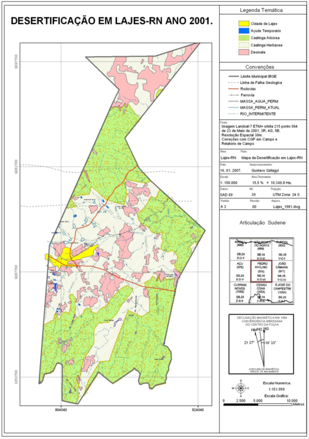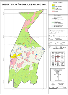SZILAGYI, Gustavo. Diagnóstico Ambiental do processo de Desertificação no município de Lajes/RNPode-se notar através dos mapas, que a evolução no quadro da desertificação no município de Lajes é assustadora, e esse quadro já deve ter evoluído mais ainda, tendo em vista que o último mapa é datado do ano de 2001. Essa questão preocupa muito, pois a desertificação em alguns casos, ou melhor, na maioria dos casos é um processo irreversível.