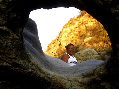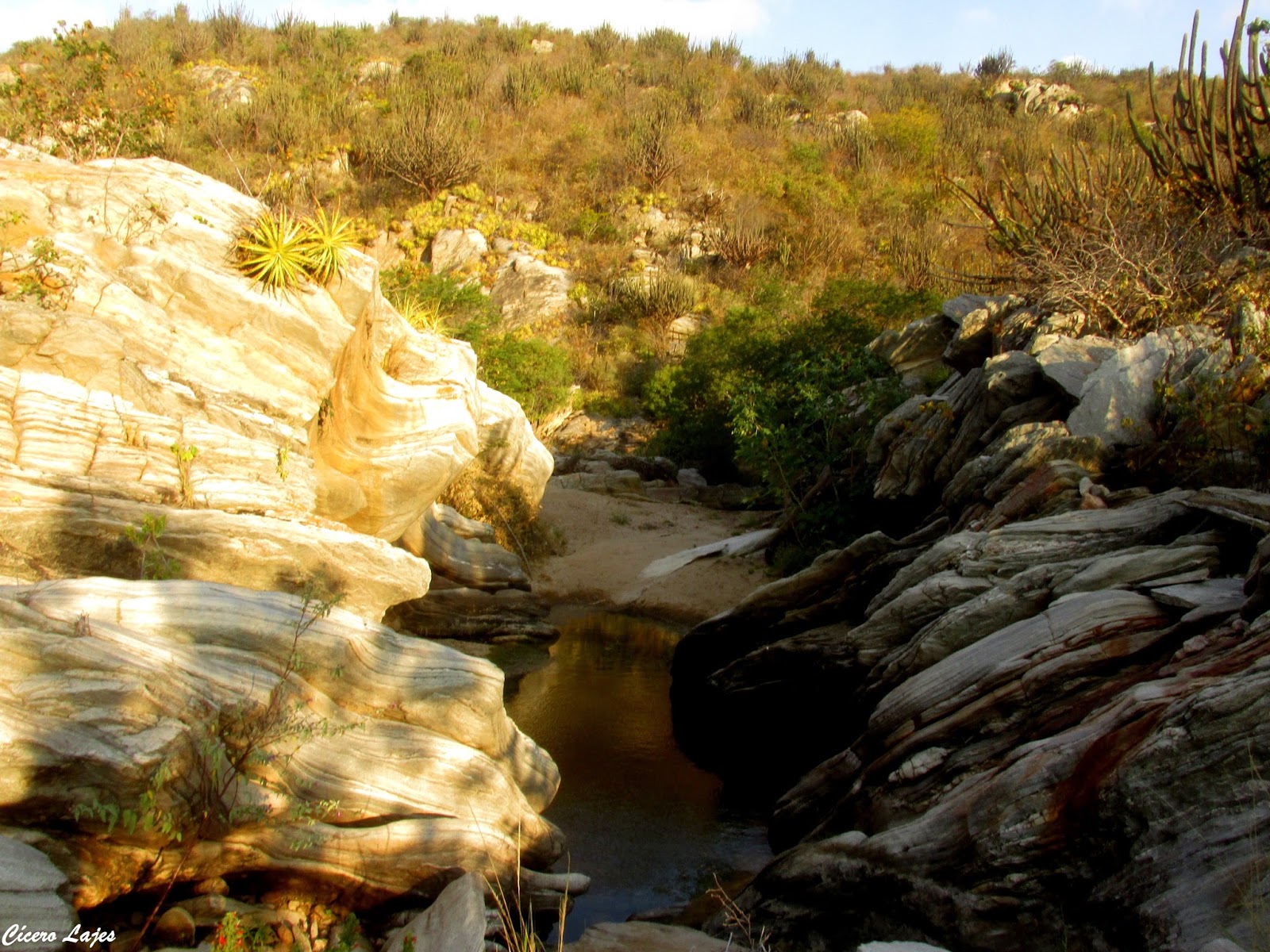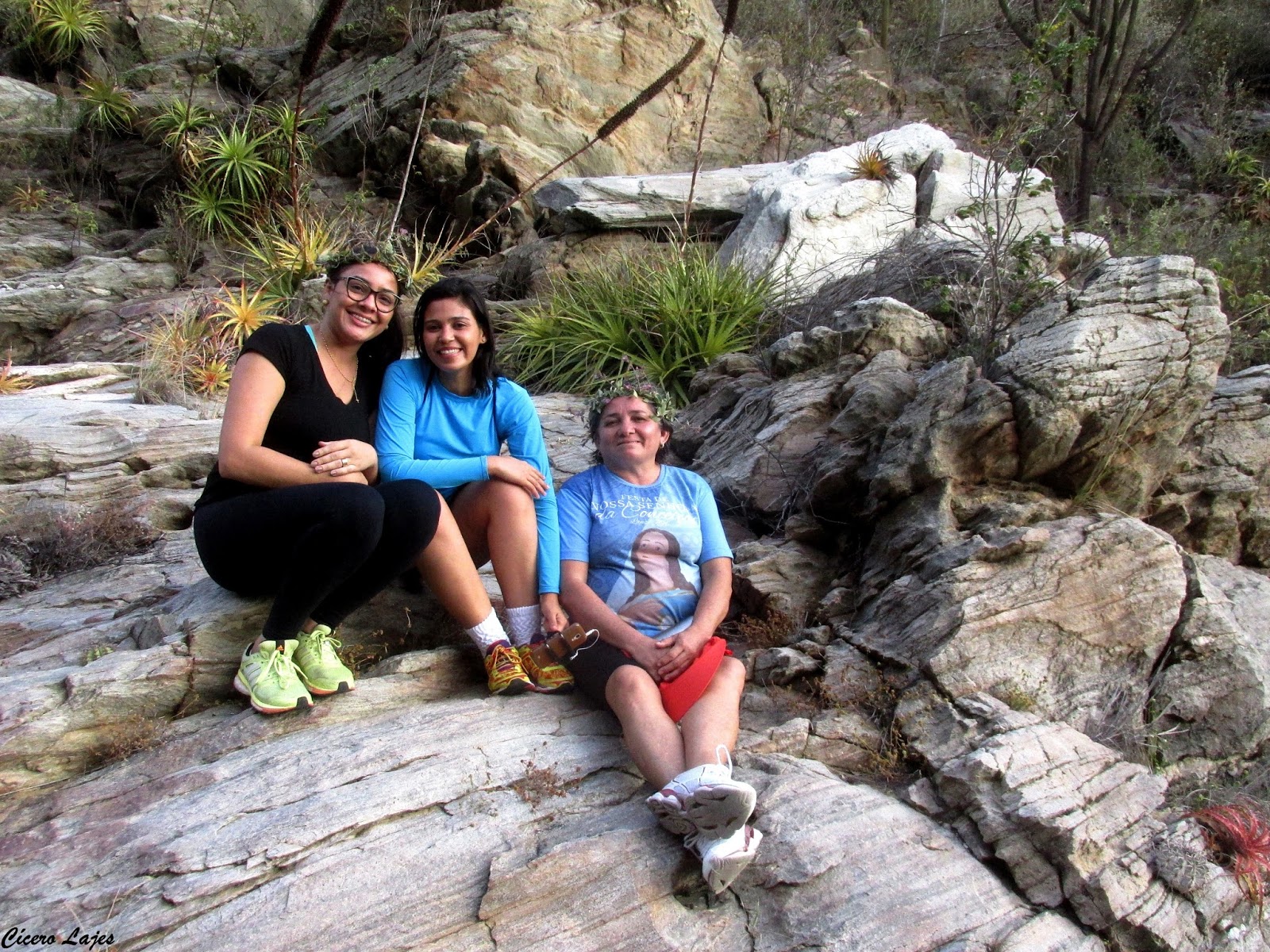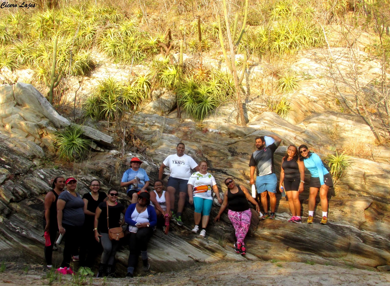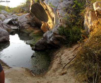 O local escolhido foi o Cânion de Santa Rosa na Serra do Feiticeiro, entre Lajes e Cerro Corá. Trata-se de um rio que corta a serra ao meio separando os paredões, ele nasce no município de Cerro Corá, e deságua no Potengi na cidade de São Tomé. Pense numa aventura! começando pelos carrapichos que grudaram nas peias, calças e pernas; depois ter que pular uma cerca e o grupo ainda teve que caminhas na areia.